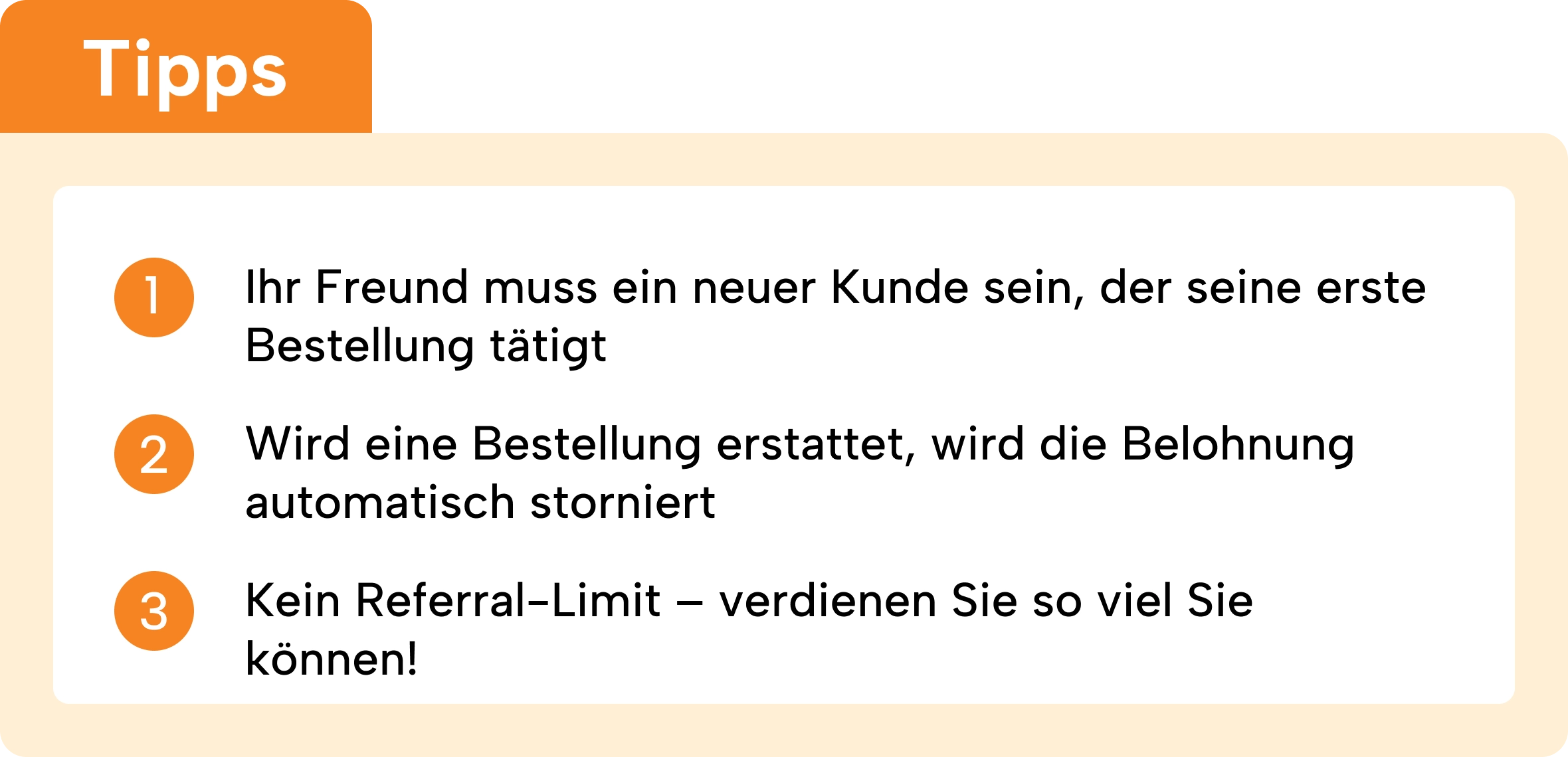 - Die Prämien werden ausgezahlt, sobald die geworbene Bestellung erfolgreich abgeschlossen und nicht storniert oder retourniert wurde – in der Regel innerhalb von 1–7 Werktagen.