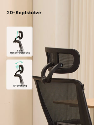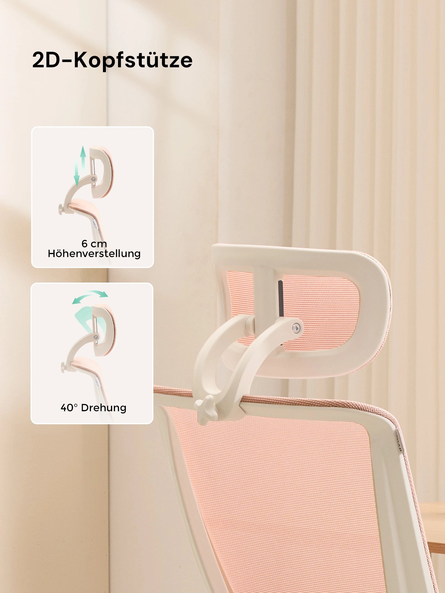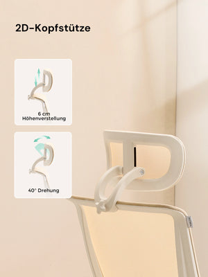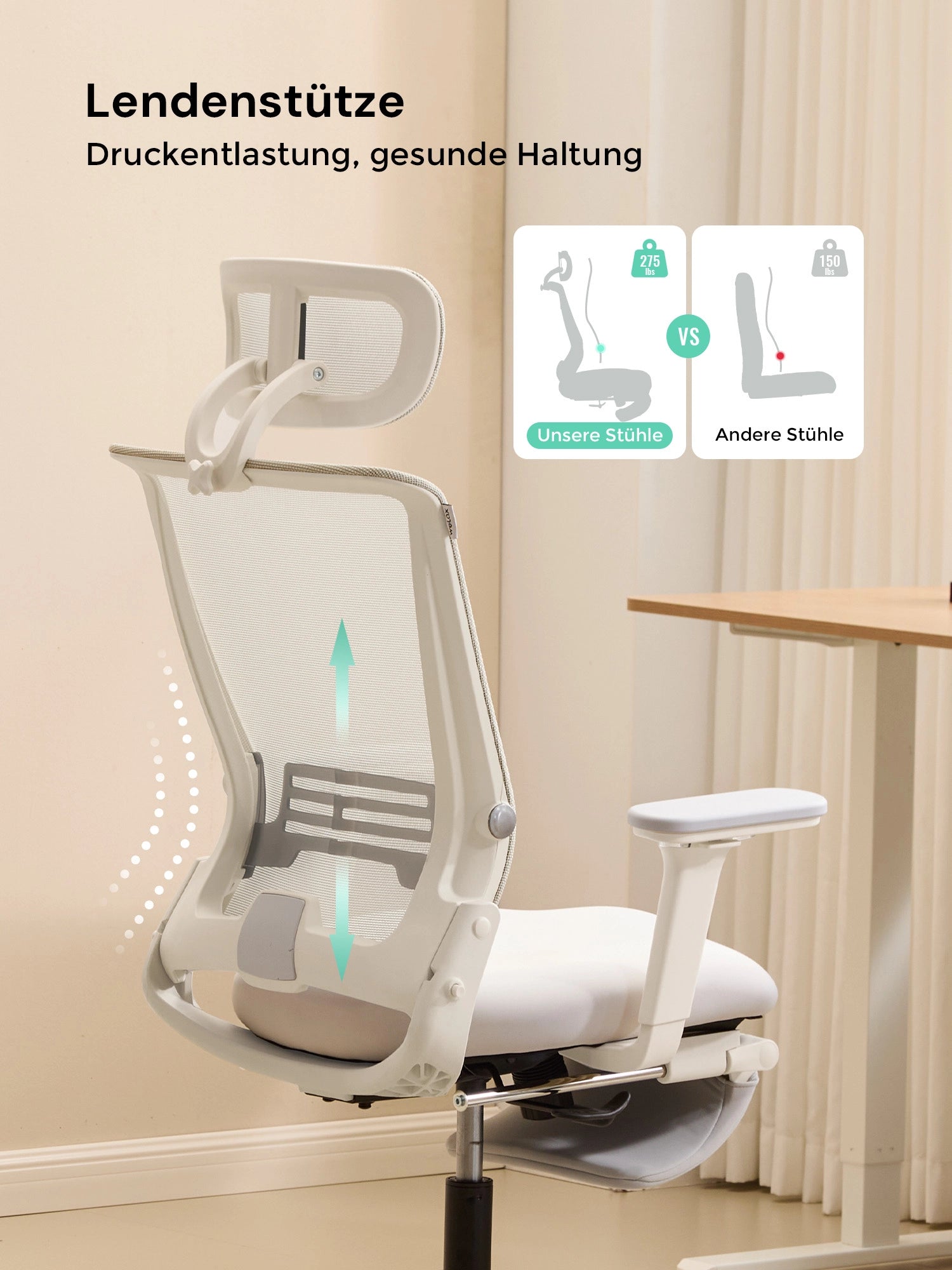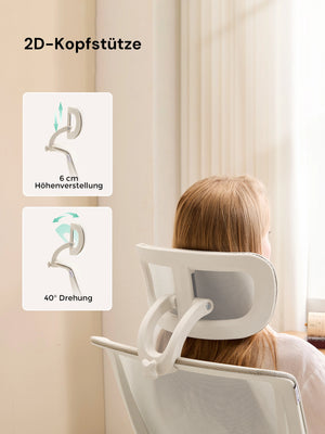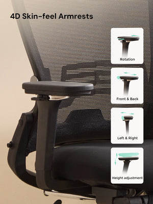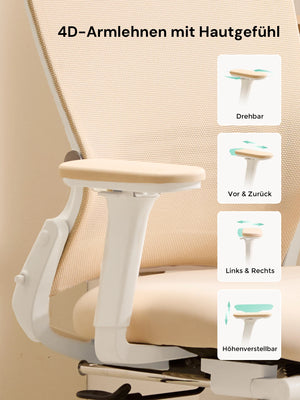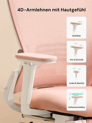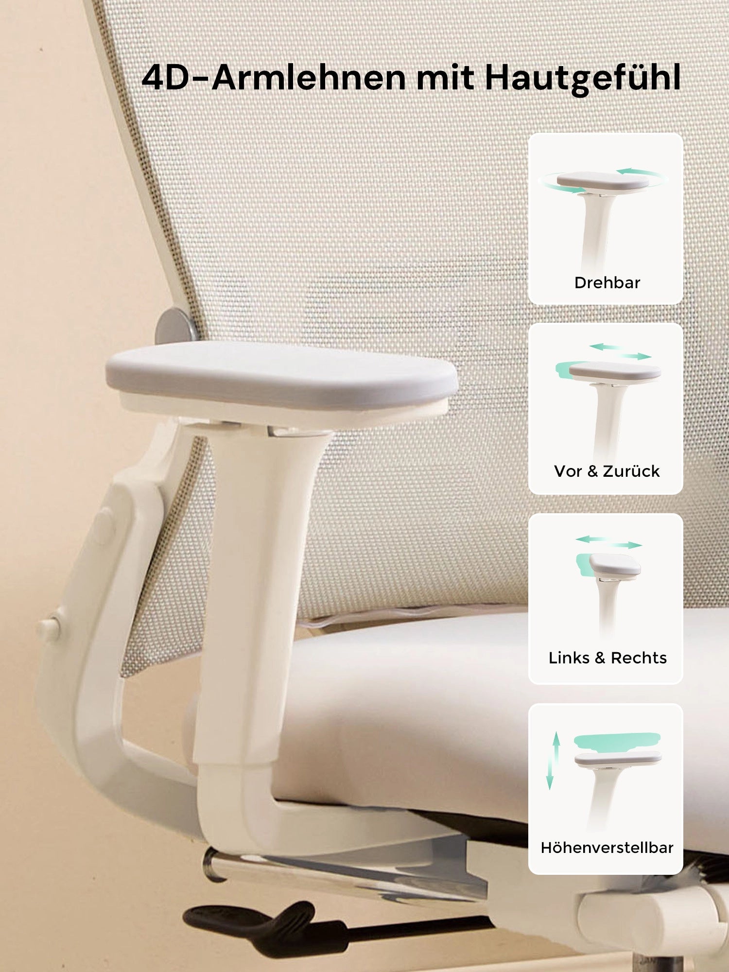 4D-Armlehnen (hoch/runter, vor/zurück, links/rechts, Drehung) passen sich verschiedenen Tischhöhen und Sitzhaltungen an und entlasten Schultern und Nacken.