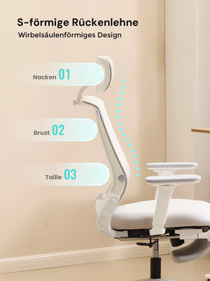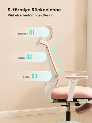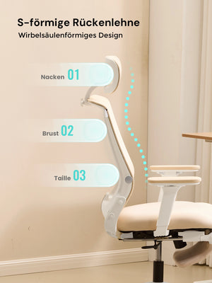 S-förmige Rückenlehne: folgt der natürlichen Krümmung der Wirbelsäule, stützt den unteren Rücken und reduziert Ermüdung.