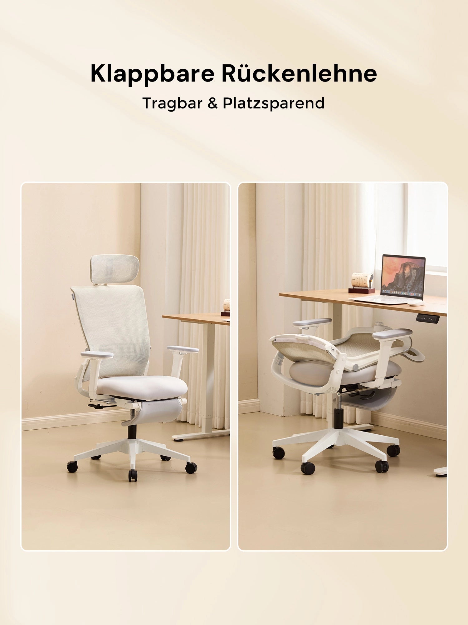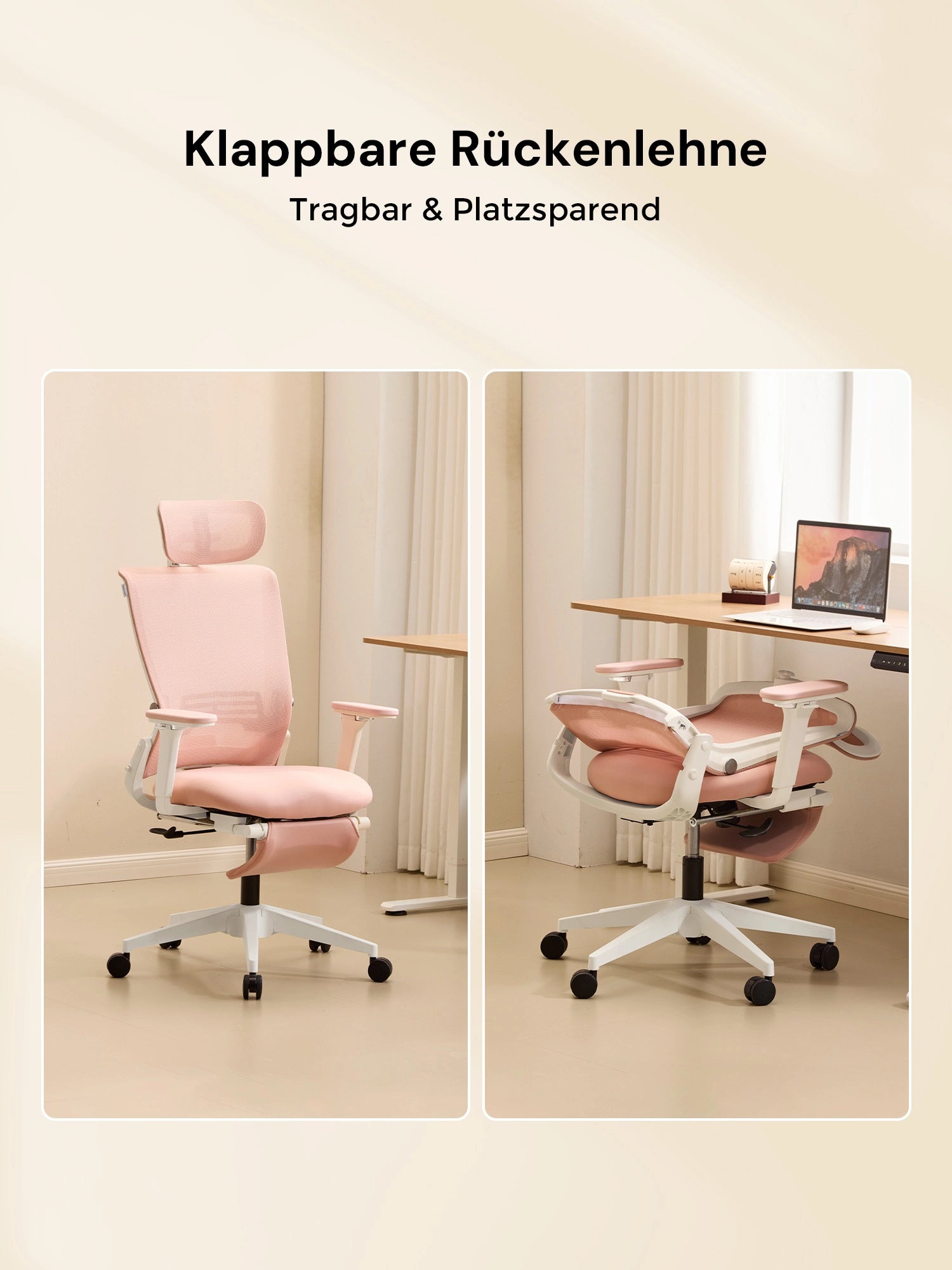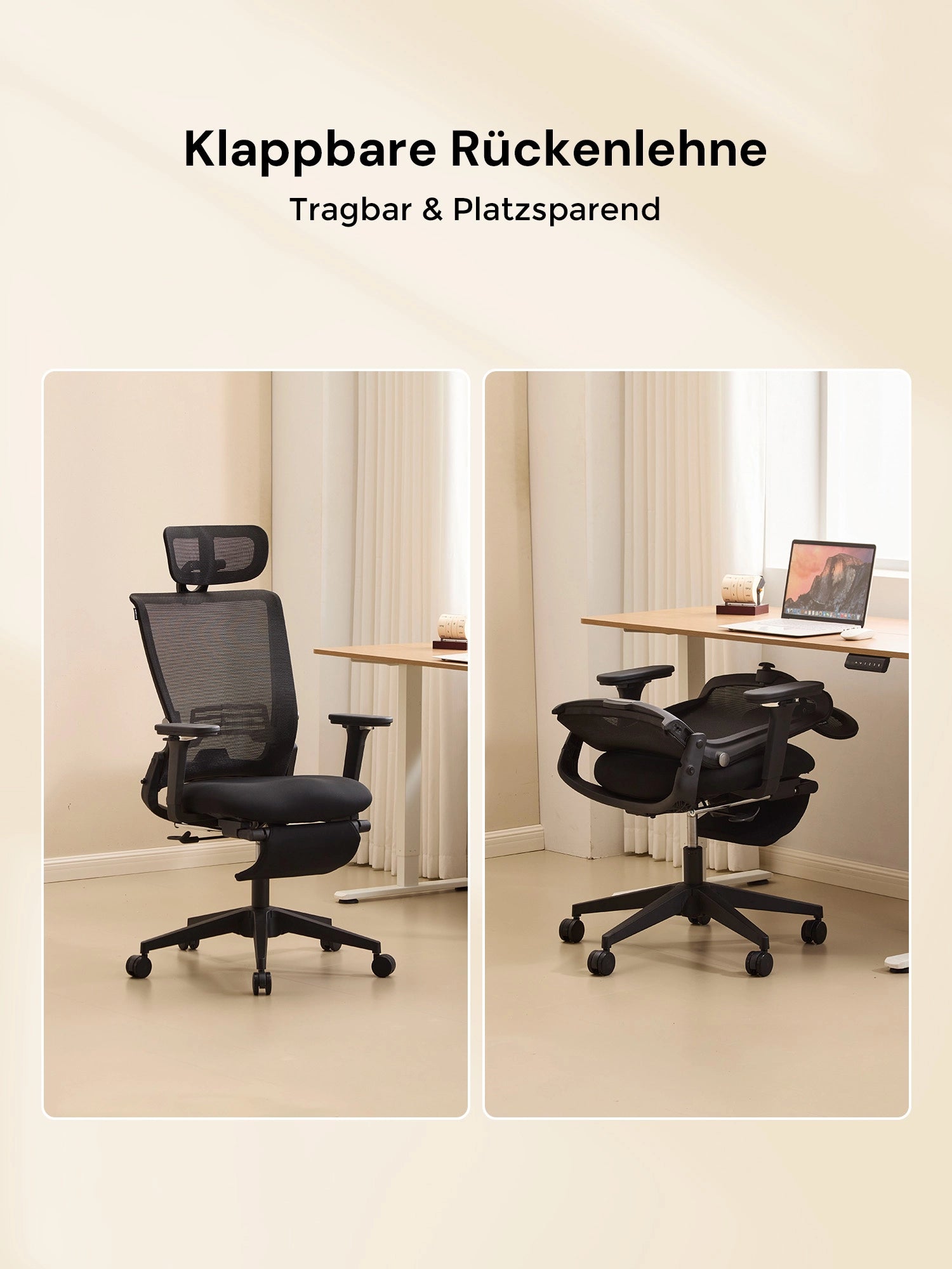 Die Rückenlehne lässt sich flexibel nach hinten klappen, sodass der Stuhl vollständig unter dem Schreibtisch verstaut werden kann. Ideal für kleine Wohnungen, Gemeinschaftsbüros oder Studentenwohnheime – für mehr Ordnung und Platzersparnis.