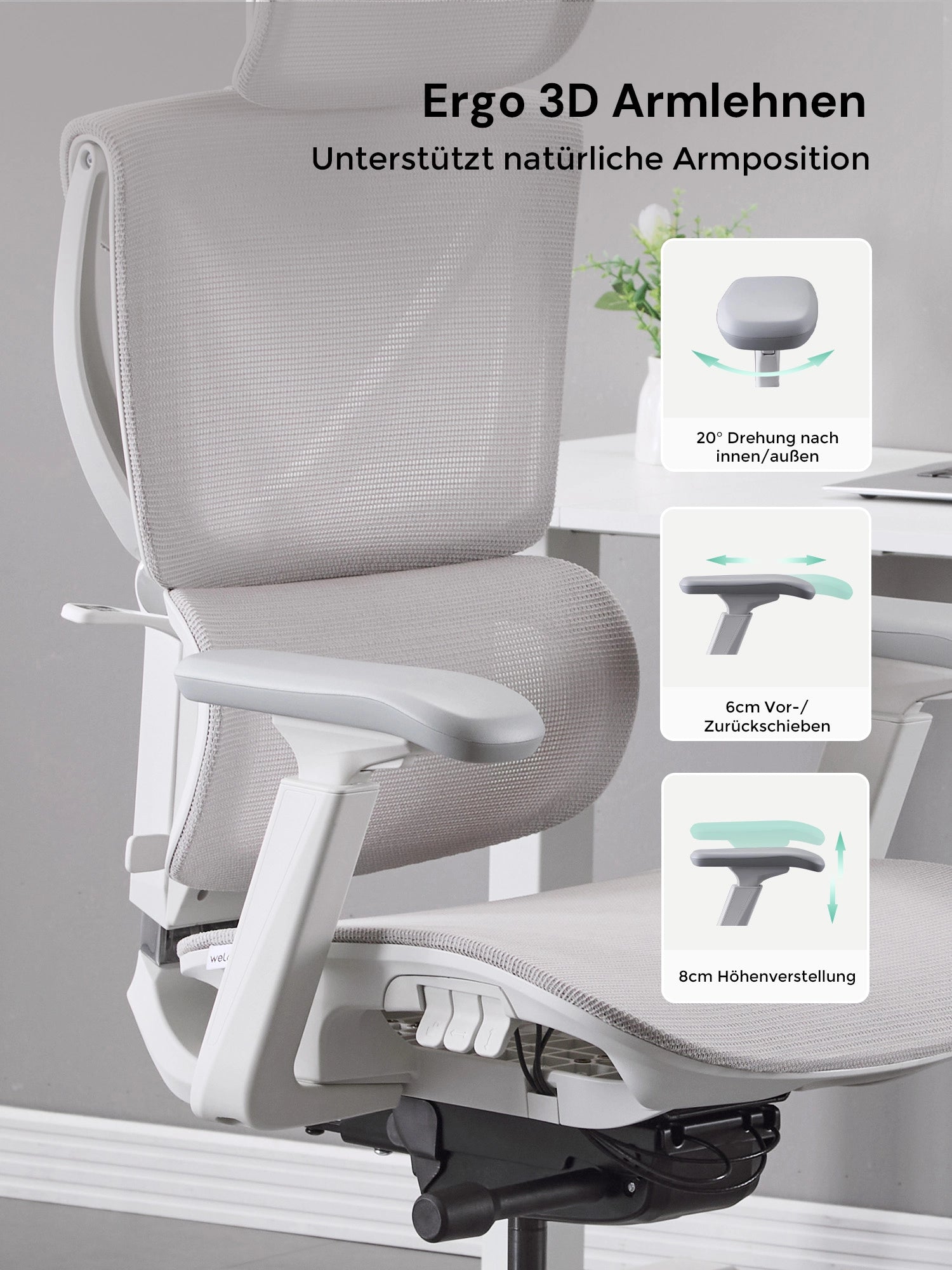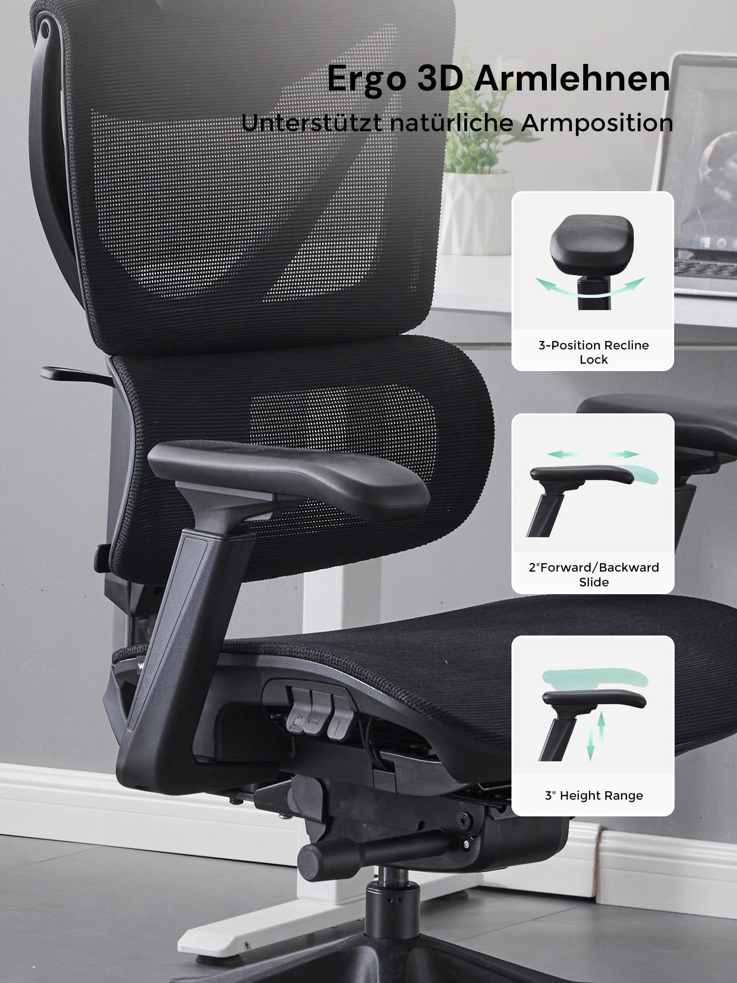 Sitzhöhe, Rückenlehne (95° / 104° / 111° / 119°) und Armlehnen lassen sich mühelos mit nur drei Tasten einstellen. Wechseln Sie blitzschnell zwischen Arbeit und Entspannung.
