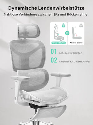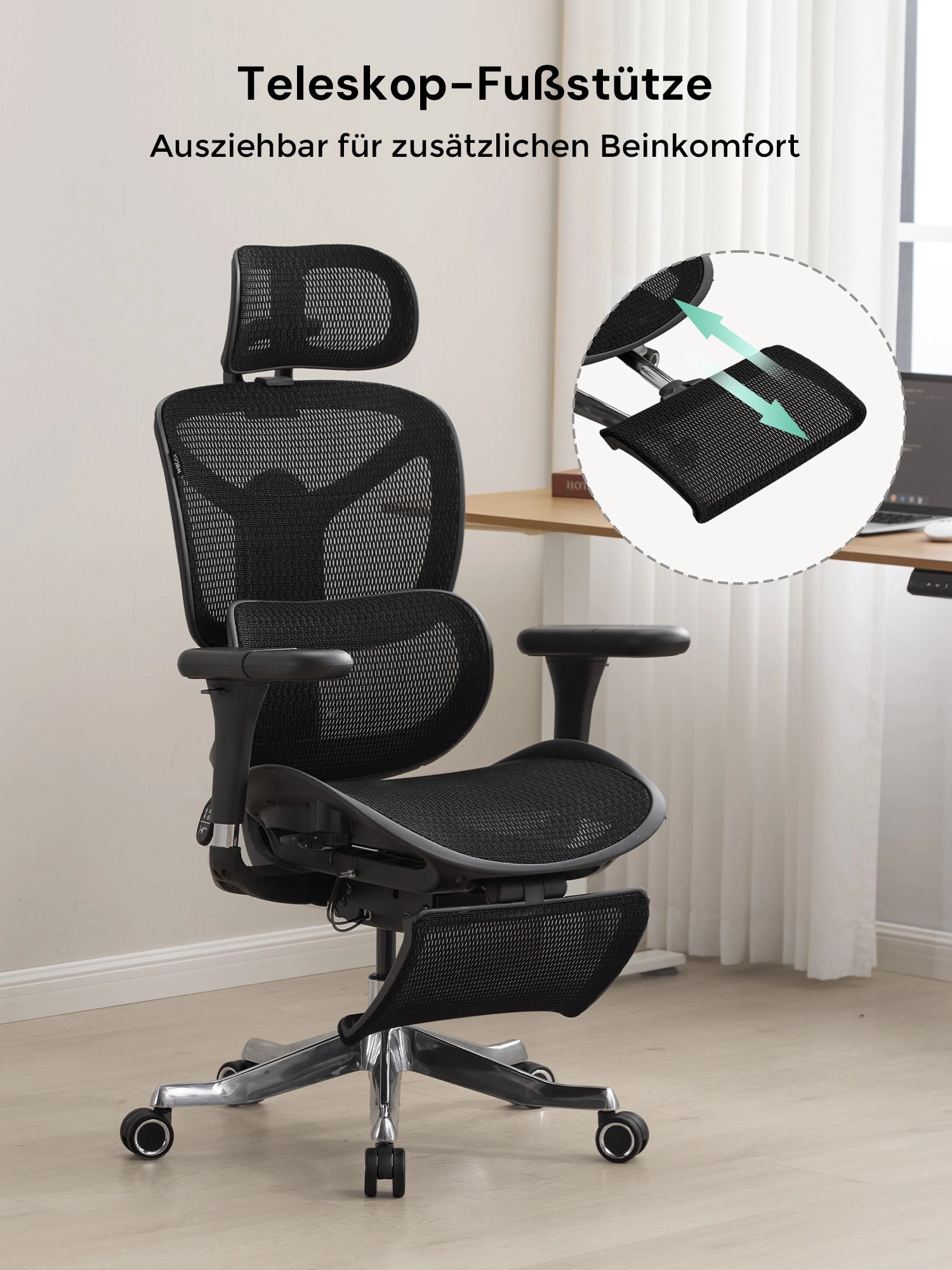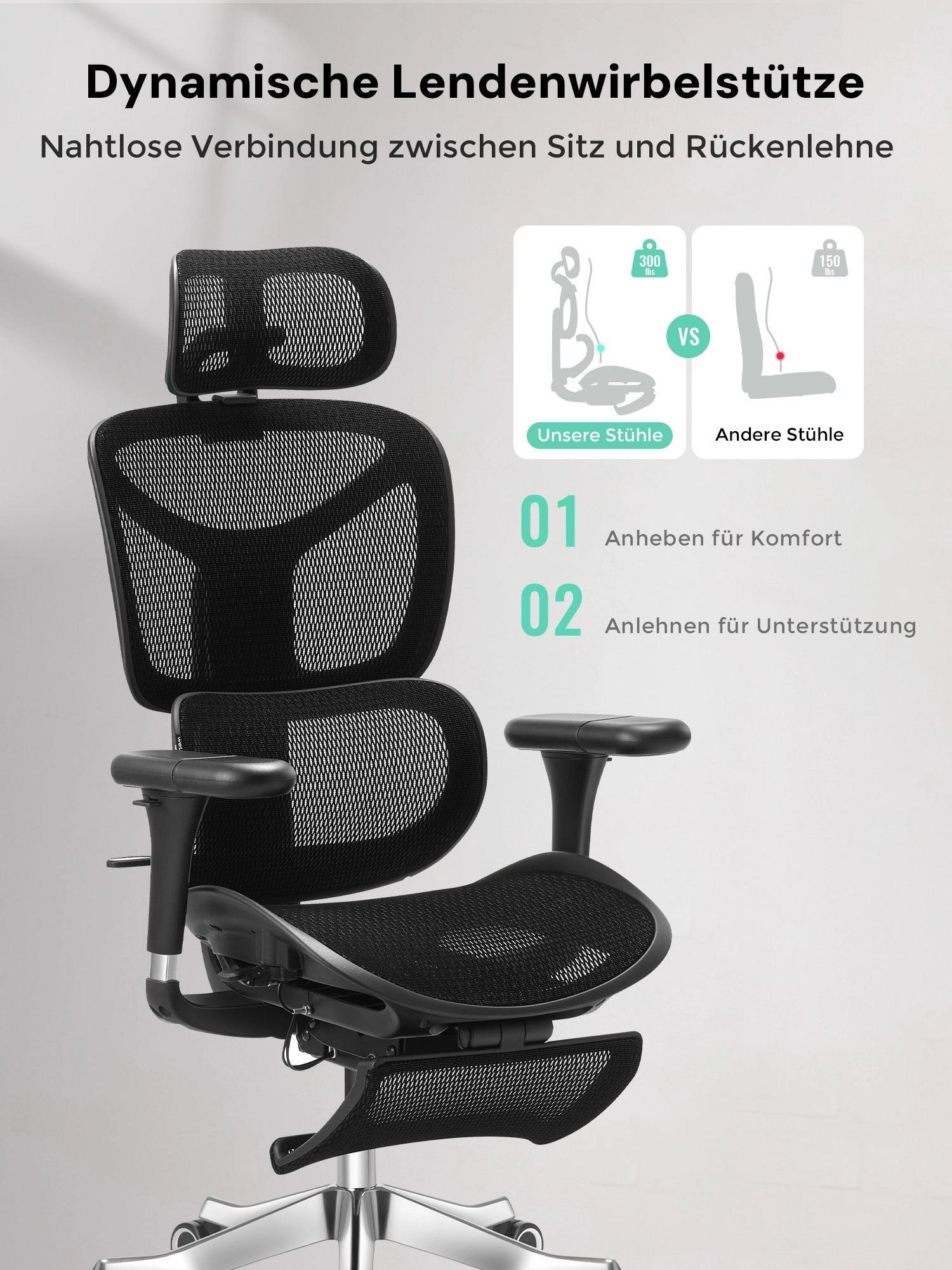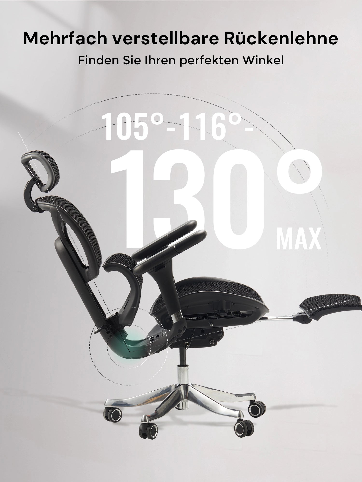 Das in Deutschland importierte Mesh-Material sorgt auch nach langen Stunden für angenehme Belüftung. Die verstärkte Aluminiumlegierungs-Basis garantiert langlebige Stabilität und hohe Belastbarkeit.
