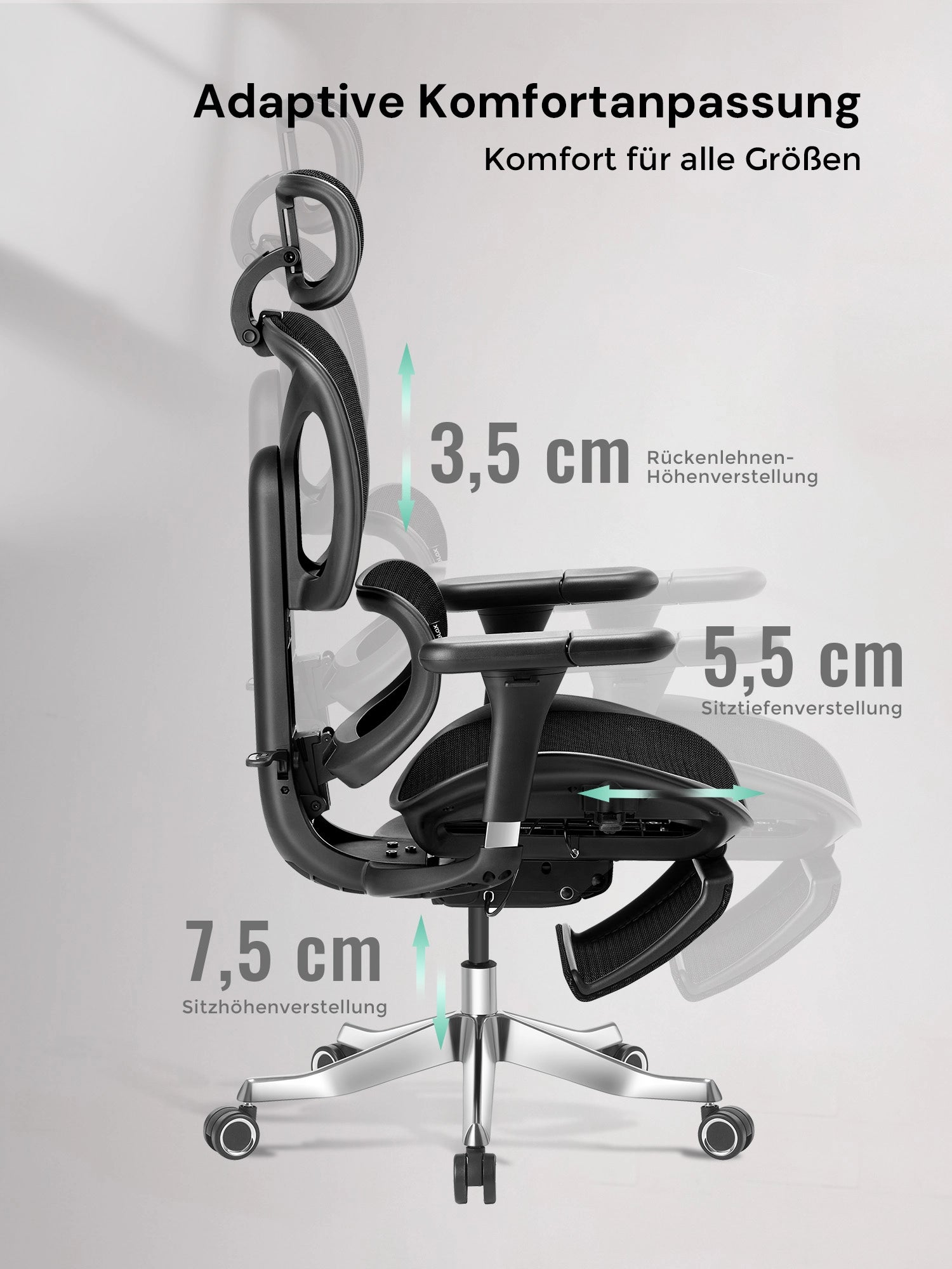 Sitztiefe, Neigungswinkel und Höhe lassen sich bequem mit nur einem Knopf einstellen. Wechseln Sie mühelos zwischen Arbeit und Entspannung – ganz ohne komplizierte Anpassungen.